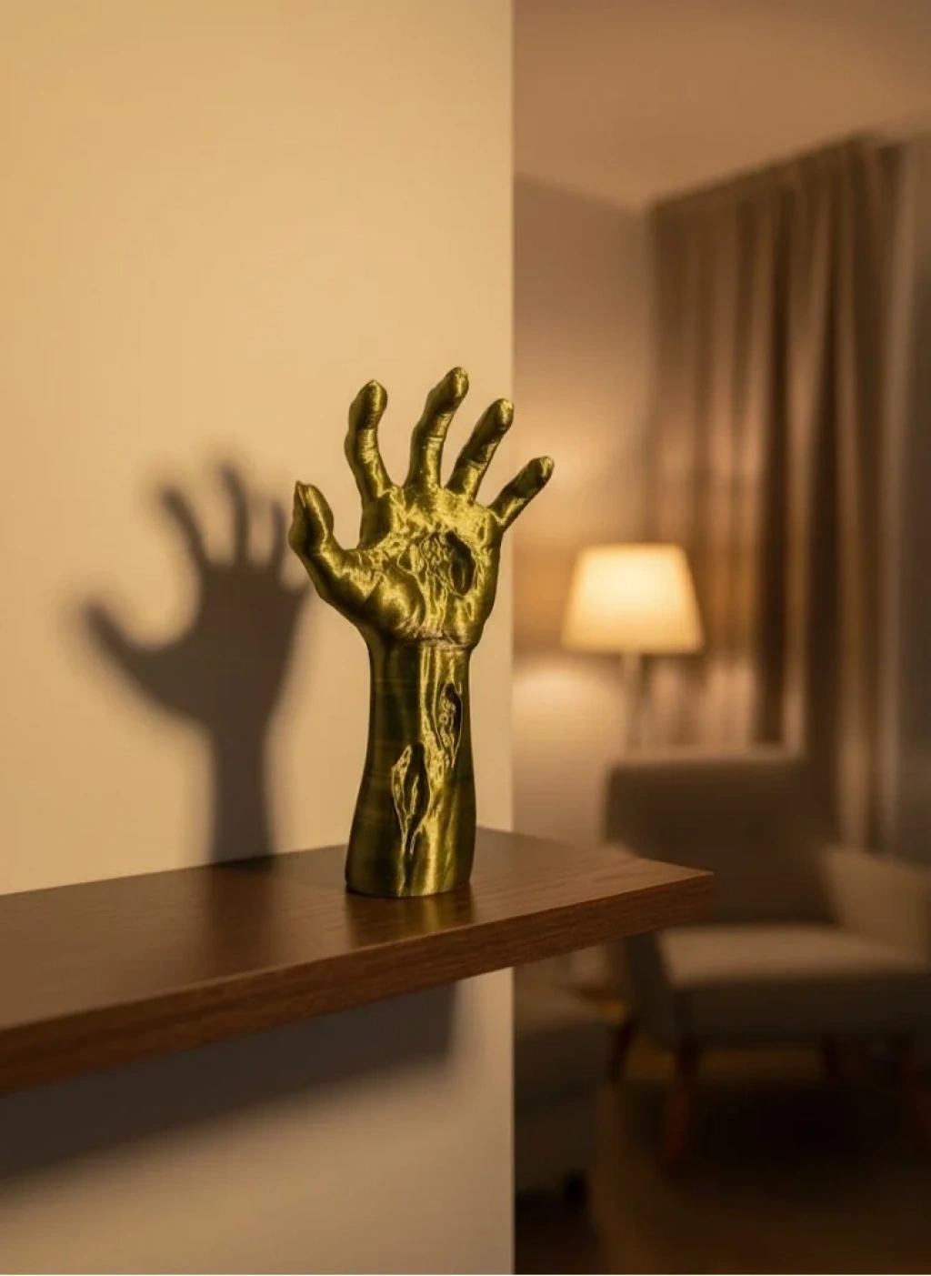Bu fantastik tasarımlı el heykeli, 22×7 cm boyutlarıyla hem kompakt hem de etkileyici bir dekoratif figür olarak öne çıkar. Ürünün yüzeyindeki damar detayları, parmak kıvrımları ve doğal dokular, heykelin 3 boyutlu etkisini artırır. Özel renk geçişlerine sahip altın–yeşil yüzeyi, ürüne hem modern hem de mistik bir görünüm kazandırmaktadır.El figürü; şans, enerji, yeni başlangıçlar ve yaratıcı güç anlamını taşır. Bu nedenle çalışma masasına, ofis köşesine veya kitaplık rafına yerleştirildiğinde güçlü bir sembolik etki oluşturur. Ürün özellikle fantastik dekor, gotik tarz, modern minimalizm veya konsept tasarım sevenler için ideal bir objedir.Dayanıklı yapısı, uzun süre şekil değiştirmeden kullanılmasına olanak sağlar. Gösterişli görünümü sayesinde hem erkek hem kadın dekor tutkunlarına hediye olarak tercih edilebilir. Koleksiyoncular, sanat severler, fantastik film ve oyun temalı dekorasyon yapanlar için eşsiz bir tamamlayıcı parçadır.