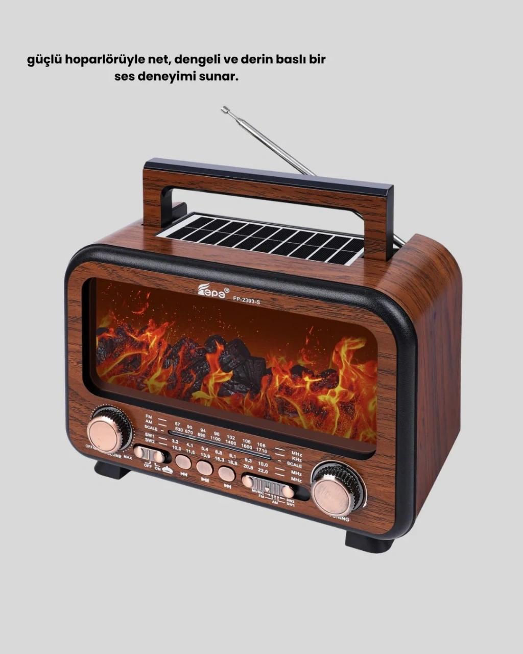 Bu şömine görünümlü solar şarjlı Bluetooth hoparlör, müziği nostaljik bir atmosferle buluşturmak isteyen kullanıcılar için benzersiz bir deneyim sunar. Hem iç hem dış mekânlarda kullanılabilen bu özel hoparlör, alev ışığı efektiyle ortama sıcak, romantik ve samimi bir hava katar. 7W gücündeki güçlü hoparlörleri sayesinde net, dengeli ve tatmin edici bir ses performansı sağlar. Bas derinliği ve tiz netliğiyle her müzik türünde ideal dinleme deneyimi sunar.Bluetooth 5.3 teknolojisi sayesinde 10 metreye kadar kopma yaşamadan stabil bağlantı elde edebilirsiniz. Telefon, tablet veya bilgisayar gibi cihazlarla kolayca eşleşir. Güneş enerjisiyle şarj olabilen solar paneli ise dış mekân kullanımında büyük avantaj sağlar; elektrik olmadan bile müziğiniz kesintiye uğramaz. Solar enerjiye ek olarak cihaz, şarj edilebilir 18650 pil ile çalışır ve USB, AUX, TF kart ve radyo seçenekleriyle çok yönlü kullanım sunar.FM/AM/SW radyo özelliği sayesinde farklı yayınları dinleyebilir, anteni uzatarak net sinyal alabilirsiniz. Taşınabilir tasarımı ve dayanıklı plastik gövdesi, kamp, bahçe partisi, piknik veya sahil akşamları gibi aktivitelerde güvenle kullanım sağlar. Üzerindeki taşıma kolu sayesinde dilediğiniz yere rahatça götürebilirsiniz.Dahili mikrofon özelliği, Bluetooth bağlantısı üzerinden telefon görüşmeleri yapmanıza olanak tanır. Yaklaşık 250x145x180 mm boyutları ve 1.63 kg ağırlığı, kompakt ama güçlü bir ses sistemi olduğunu gösterir. Dekoratif şömine görünümü modern yaşam alanlarına şıklık katar. Hem görsel hem işitsel olarak keyifli, etkileyici ve fark yaratan bir deneyim sunar.
