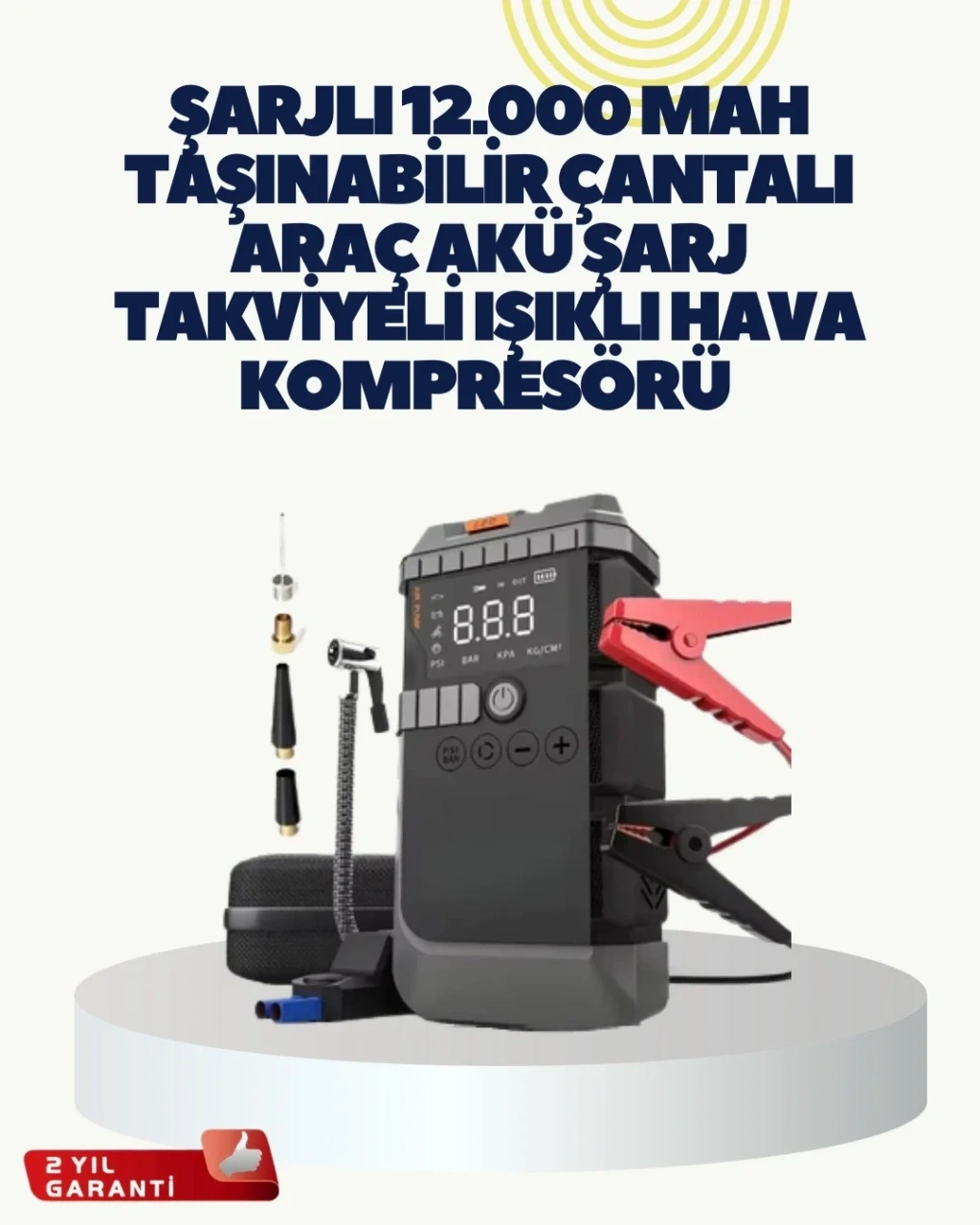 Çok fonksiyonlu yapısı ile öne çıkan bu taşınabilir araç yardım ünitesi, sürüş güvenliğini artırmak ve yolculuk sırasında yaşanabilecek beklenmedik durumlara karşı hazırlıklı olmak isteyen kullanıcılar için geliştirilmiştir. Akü takviye özelliği sayesinde araç aküsünün zayıfladığı veya tamamen bittiği durumlarda hızlı müdahale imkânı sunar. Yüksek performanslı bataryası, zorlu hava koşullarında dahi güvenilir bir kullanım sağlar. Kompakt boyutları sayesinde araç içinde fazla yer kaplamadan taşınabilir ve her an kullanıma hazır tutulabilir.Dijital hava kompresörü, sadece araç lastikleri için değil, bisiklet, motosiklet ve çeşitli şişirilebilir ekipmanlar için de pratik bir çözüm sunar. Basınç ayarlama ve otomatik durdurma fonksiyonları, kullanıcı hatalarını minimize ederek güvenli bir deneyim sağlar. Dijital ekran, ölçüm değerlerinin kolayca okunmasına olanak tanır ve lastik bakımını zahmetsiz hale getirir. Powerbank özelliği, yolculuk sırasında telefon, tablet ve benzeri cihazların şarj edilmesine olanak tanıyarak sürücünün bağlantıda kalmasını sağlar.LED aydınlatma sistemi, karanlık ortamlarda görüşü artırırken aynı zamanda acil durumlarda fark edilmenizi kolaylaştırır. Uzun pil ömrü sayesinde tek şarjla birden fazla işlevi yerine getirebilir. Taşıma çantası ile birlikte sunulan bu cihaz, hem düzenli saklama hem de darbelere karşı koruma sağlar. Günlük kullanımda, uzun yolculuklarda veya kamp ve outdoor aktivitelerinde güvenilir bir yol arkadaşı olarak öne çıkar.