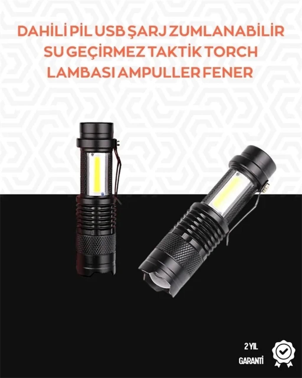 Bu kompakt LED el feneri, 2000 lümene kadar çıkabilen parlaklığı ile karanlık ortamlarda güçlü bir aydınlatma sağlar. Gövdesi alüminyum alaşımdan yapılmış olup suya ve kaymaya karşı dayanıklıdır. Dışbükey lens ile ışık odak mesafesi ihtiyaca göre ayarlanabilir. 4 ışık modu (yüksek, düşük, strobe, COB) arka düğme üzerinden kontrol edilir. 14500 şarj edilebilir pil dahildir. Klips sayesinde kemer veya çantaya sabitlenebilir. Kamp, avcılık, bisiklet, tırmanış gibi aktivitelerde rahatlıkla kullanılabilir. Uzun süre kullanılmayacaksa pil çıkarılmalıdır. Göz ile doğrudan temastan kaçınılmalıdır.