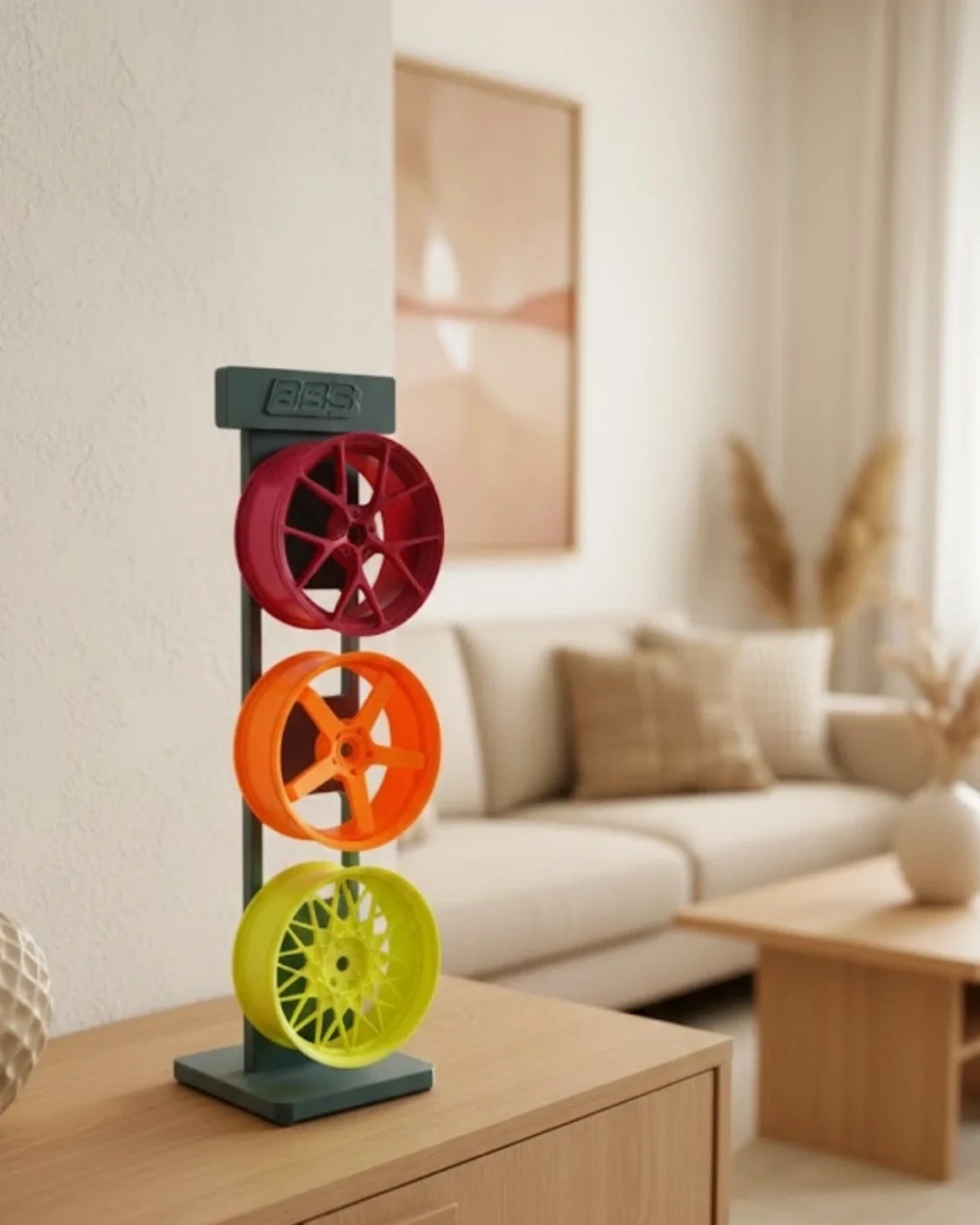 Bu üçlü jant dekor seti, renkli ve modern tasarımıyla ev ve ofis dekorasyonuna enerjik bir hava katar. Masa üstü kullanım için ideal yapısı sayesinde salon orta sehpası, konsol veya kitaplık üzerinde sergilenebilir. Minimal ve spor çizgileri, modern dekorasyon stilleriyle kolayca uyum sağlar. Otomobil tutkunları için özel bir dekor parçası olmasının yanı sıra şık bir hediye alternatifi olarak da tercih edilebilir.