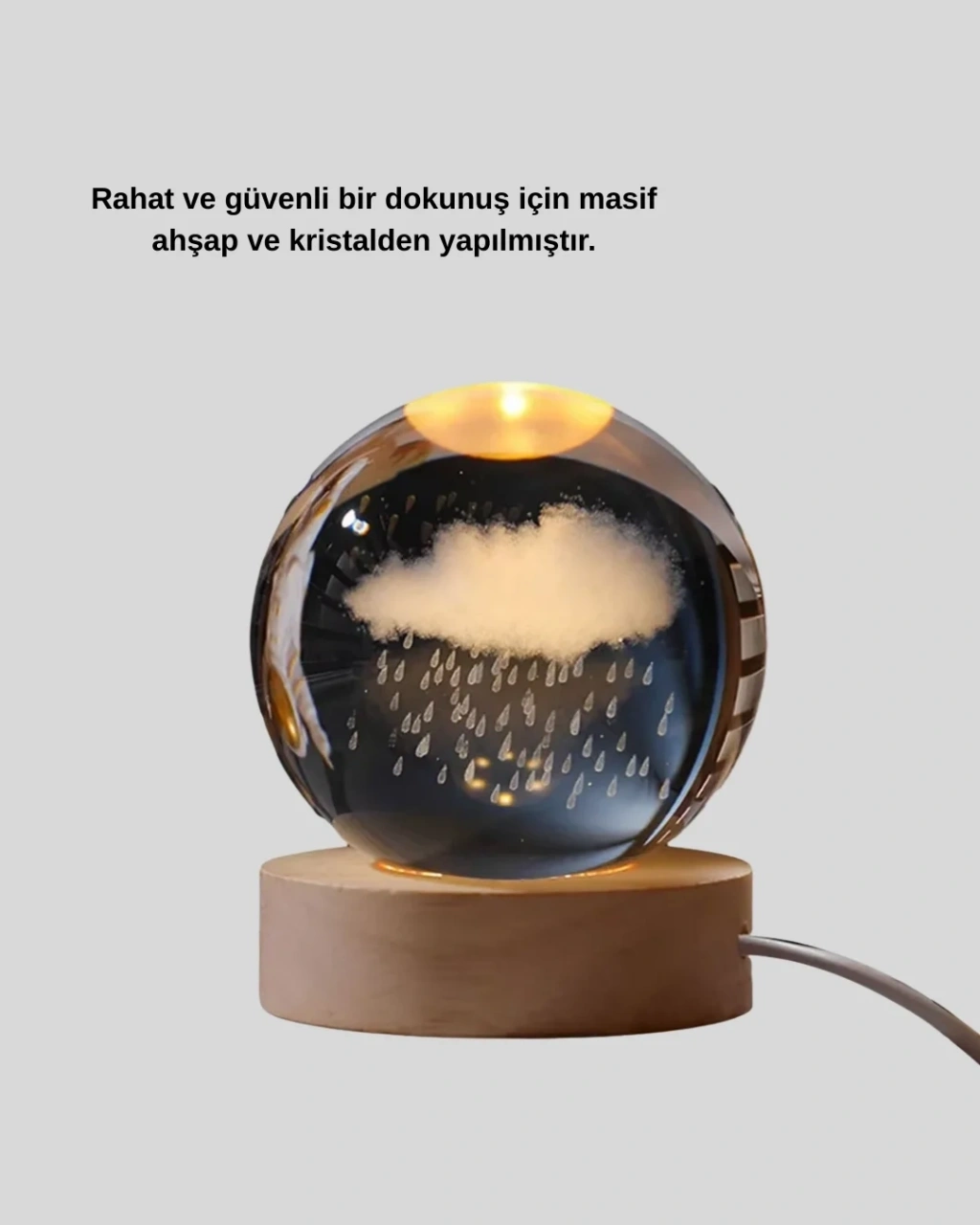 USB Gece Lambası LED 3D Yağmur Bulut Kristal Küre, evinizin her köşesine sıcak, huzurlu ve romantik bir atmosfer taşıyan özel bir dekoratif aydınlatma ürünüdür. 3D lazer teknolojisi ile işlenmiş yağmur bulutu motifi, kristalin içinde adeta havada süzülüyormuş gibi görünen etkileyici bir derinlik hissi yaratır. Kürenin içindeki detayların netliği ve parlaklığı, ürünü sıradan bir gece lambasının ötesine taşıyarak sanatsal bir obje haline getirir.3000K sıcak ışık tonu, göz yormayan yumuşak bir aydınlatma sağlayarak hem çocuklar hem yetişkinler için ideal bir kullanım sunar. Yatak odasında gece lambası olarak, salonda dekoratif ışık olarak, ofiste masabaşı ambiyans aydınlatması olarak kullanılabilir. Ahşap tabanı doğal, güvenli ve dayanıklı bir yapı sunarken kristal malzeme kalite hissini en üst seviyeye çıkarır.USB girişi sayesinde powerbank, adaptör veya bilgisayara kolayca bağlanarak her ortamda rahatça kullanılabilir. Pil derdi olmaması, ekonomik ve pratik kullanım sağlar. Kompakt boyutları (8 cm kristal top, 7.5 cm ahşap taban) sayesinde her yere uyum sağlar ve yer kaplamaz.Doğum günü, yılbaşı, sevgililer günü, anneler günü gibi özel günlerde hediye olarak tercih edilebilecek şık ve anlamlı bir seçimdir. Özellikle dekorasyon meraklıları, çocuklar, gençler ve yaratıcı tasarımları seven herkes için mükemmel bir sürpriz olacaktır.