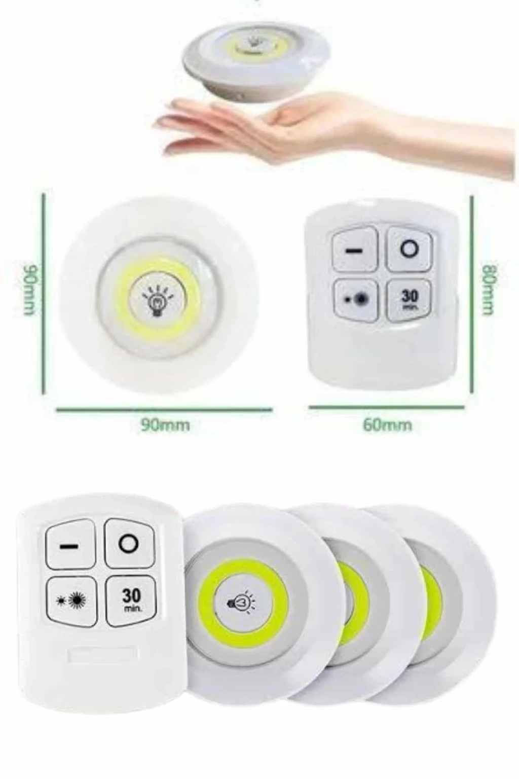 Kumandalı Kablosuz LED Spot Işık Seti – 3'lü Paket | Ayarlanabilir Parlaklık, Zamanlayıcı, Kolay KurulumEvinizde aydınlatma ihtiyaçlarınıza pratik ve es bir çözüm arıyorsanız, bu kablosuz LED spot ışık seti tam size göre. Modern tasarımı ve işlevsel özellikleriyle dikkat çeken bu ürün; banyo, mutfak, gardırop, merdiven altı, kitaplık ve daha birçok noktada ideal bir yardımcı olarak öne çıkar. Minimal boyutları sayesinde fazla yer kaplamaz, ancak COB LED teknolojisi sayesinde etkili ve yeterli bir aydınlatma sağlar.Set içerisinde yer alan 3 adet spot lamba, pille çalıştığından kablo karmaşası yaratmaz ve elektrik bağlantısı olmayan alanlarda da rahatlıkla kullanılabilir. Her biri 3 adet AAA pil ile çalışır (piller pakete dahil değildir). Uzaktan kontrol imkanı sunan akıllı kumandasıyla ışıkların parlaklığını dilediğiniz seviyeye getirebilir, açma-kapama işlemlerini mesafe fark etmeksizin gerçekleştirebilir ve 30 dakikalık zamanlayıcı kurarak ışıkların otomatik olarak kapanmasını sağlayabilirsiniz. Ayrıca her spotun üzerinde bulunan tuşlarla manuel kullanım da mümkündür.Kumandayı sürekli el altında tutmak isteyen kullanıcılar için özel bir duvar atı da set içerisinde yer alır. Bu atı dilediğiniz düz yüzeye sabitleyerek kumandanızı kaybetme riskini ortadan kaldırabilirsiniz. Montaj işlemi son derece basittir; güçlü çift taraflı yapışkan bantlar sayesinde vidalama veya delme işlemlerine gerek kalmadan ürünleri kolayca monte edebilirsiniz.Ev dekorasyonuna zarif bir dokunuş katan bu LED spot seti, kullanıcı dostu özellikleri ve yüksek performansıyla yaşam alanlarınıza hem es hem de fonksiyonel bir katkı sunar.