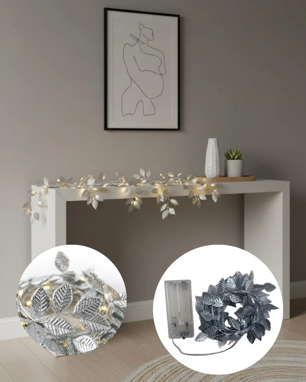 Gümüş yaldızlı yaprak LED ışık, dekoratif aydınlatmada sade ama etkili bir görünüm sunar. Yaprak formundaki detaylar, ürüne doğal bir es kazandırırken gümüş rengi ile modern bir duruş sergiler.Pilli yapısı sayesinde priz bağımlılığı olmadan kullanılabilir. Bu özellik, ürünü evin her alanında özgürce konumlandırmaya olanak tanır. Raf, vitrin, masa üstü ve duvar dekorasyonlarında rahatlıkla tercih edilebilir.Sıcak ışık tonu, bulunduğu ortamda huzurlu ve sıcak bir atmosfer yaratır. Kalabalık süslemeler yerine sade ama şık bir dekorasyon isteyenler için idealdir. Yılbaşı süslemeleri ve özel gün dekorları için de uygun bir seçenektir.Yaprak detaylarının metalik yüzeyi, ışık açıkken zarif yansımalar oluşturur. Işık kapalıyken de dekoratif bir aksesuar olarak kullanılabilir.Ev, ofis ve vitrin dekorasyonunda es, pratik ve kullanışlı bir LED aydınlatma ürünü arayanlar için ideal bir tercihtir.