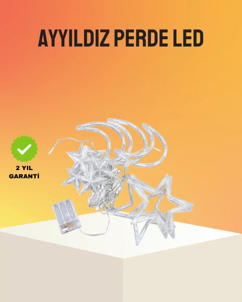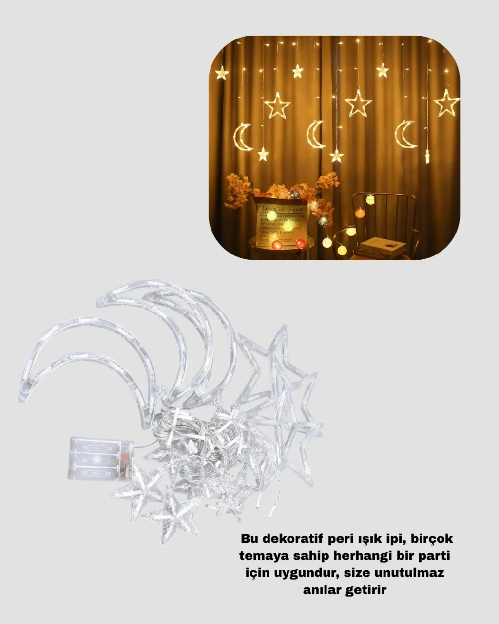 Prizli Yıldız Ay Perde LED Işık, ev ve ticari alanlarda dekoratif aydınlatma ihtiyacını karşılamak üzere tasarlanmıştır. Yıldız ve ay figürlerinin oluşturduğu zarif tasarım, mekâna masalsı ve romantik bir hava katar.Toplam 126 LED içeren yapı, dengeli ışık yayılımı sağlar. Göz yormayan yapısı ile uzun süreli kullanımlarda konfor sunar. Sabit ve yanıp sönme olmak üzere iki farklı ışık modu ile ortamın havası kolayca değiştirilebilir.Prizden çalışması, ürünün kesintisiz ve stabil bir şekilde kullanılmasını sağlar. Elektrik bağlantısı olan her alanda güvenle kullanılabilir. Pil değiştirme derdi olmadan uzun süreli dekorasyonlar için idealdir.PVC kaplı kablo yapısı güvenli kullanım sunar ve ısınma yapmaz. Kurulumu oldukça basittir ve farklı alanlarda kolayca kullanılabilir. Ev dekorasyonundan organizasyon süslemelerine kadar geniş bir kullanım alanı sunar.