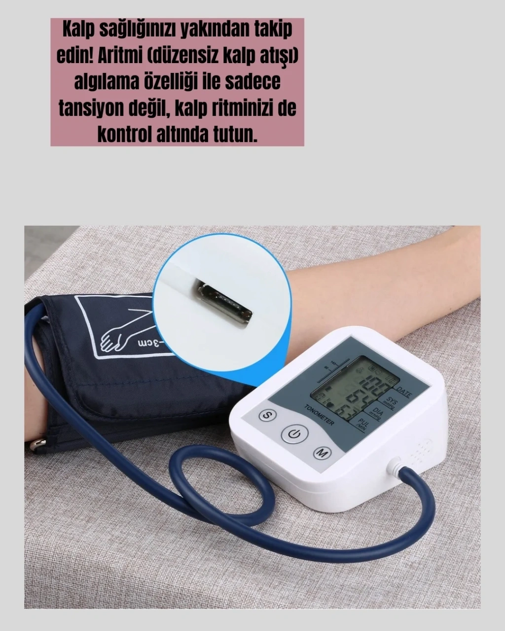 Yüksek hassasiyetli elektronik tansiyon ölçer, profesyonel ölçüm sonuçlarını evinize taşıyan modern bir cihazdır. ±3mmHg hata payı ile son derece güvenilir ölçümler sunar. IHB aritmi tespiti sayesinde kalp ritminizdeki düzensizlikleri algılayarak olası riskler hakkında sizi önceden uyarır.LCD dijital ekran, ölçüm sonuçlarını büyük ve okunaklı bir şekilde gösterir. WHO kan basıncı sınıflandırma sistemi, sonuçlarınızı renkli göstergelerle değerlendirerek ölçümlerinizi daha kolay anlamanızı sağlar. Nabız tarama ve osilometri yöntemleri ile ölçüm yapabilen cihaz, doğruluğunu iki kat artırır.2 kullanıcı için ayrı ayrı 99 ölçüm hafızasına sahiptir. Bu sayede aile bireyleri ölçüm verilerini düzenli olarak takip edebilir. Kompakt tasarımı ve 300 gramlık hafifliği ile taşınabilir bir yapıya sahiptir. 4 adet AAA pil veya USB kablo ile kullanılabilmesi, enerji ihtiyacını karşılamada esneklik sağlar. Paket içeriğinde tansiyon ölçüm bandajı, kullanım kılavuzu ve monitör bulunmaktadır. Düzenli tansiyon takibi yapmak isteyen herkes için ideal bir üründür.