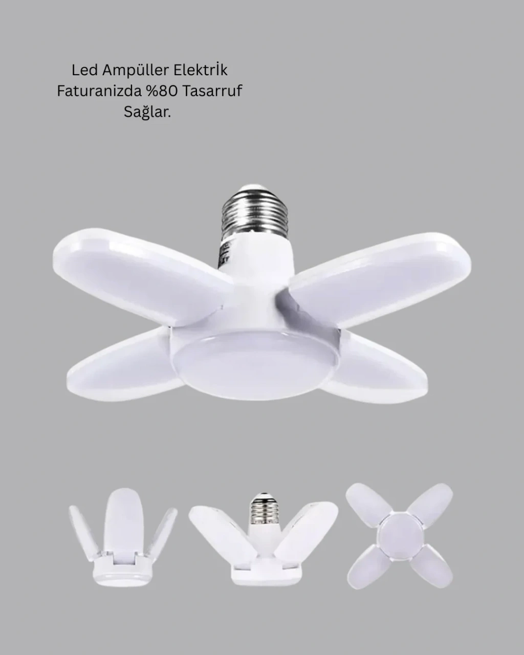 Enerji tasarruflu 4 kollu katlanır pervane LED ampül, yüksek ışık gücü ile maksimum performans sunar. 6000 lumen aydınlatma kapasitesi, karanlık alanları saniyeler içinde aydınlatırken beyaz ışık rengi net ve doğal bir görüş sağlar.LED teknolojisi, düşük enerji tüketimi ile çevre dostu bir kullanım sunar ve elektrik faturasında ciddi tasarruf sağlar. 60 Watt gücüyle klasik yüksek wattlı ampullerin yerini rahatlıkla alır. Katlanabilir kolları sayesinde ışık dağılımı dengeli ve geniş açılıdır.Kolay montaj özelliği sayesinde ekstra tesisat gerektirmez. Dayanıklı malzemesi uzun süreli kullanım için uygundur. Ev, ofis, depo ve ticari alanlarda güvenle tercih edilebilir.