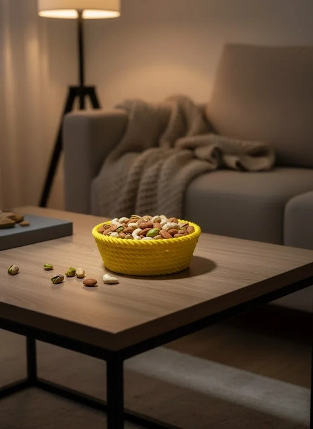 Yuvarlak Çerezlik Sarı 4×12 cm ölçüsüyle salon ve masa üstü sunumlar için ideal boyutta tasarlanmıştır. Canlı sarı rengi sayesinde bulunduğu ortama enerji ve sıcaklık katar. Özellikle loş ve sıcak salon aydınlatmalarında dikkat çekici bir dekoratif unsur olarak öne çıkar.Örgü dokulu tasarımı ürüne modern ve es bir görünüm kazandırır. Çerez, kuru yemiş, draje, şekerleme ve küçük atıştırmalıkların sunumu için uygundur. Kompakt yapısı sayesinde sehpa, orta masa ve raf üstlerinde düzenli bir görünüm sağlar.Hem günlük kullanım hem de misafir ağırlama anlarında pratiklik sunar. Minimal ölçüleriyle fazla yer kaplamaz ve masa düzenini bozmadan şık bir sunum imkânı tanır. Sarı rengiyle modern, bohem ve sade dekorasyon stilleriyle uyum sağlar.