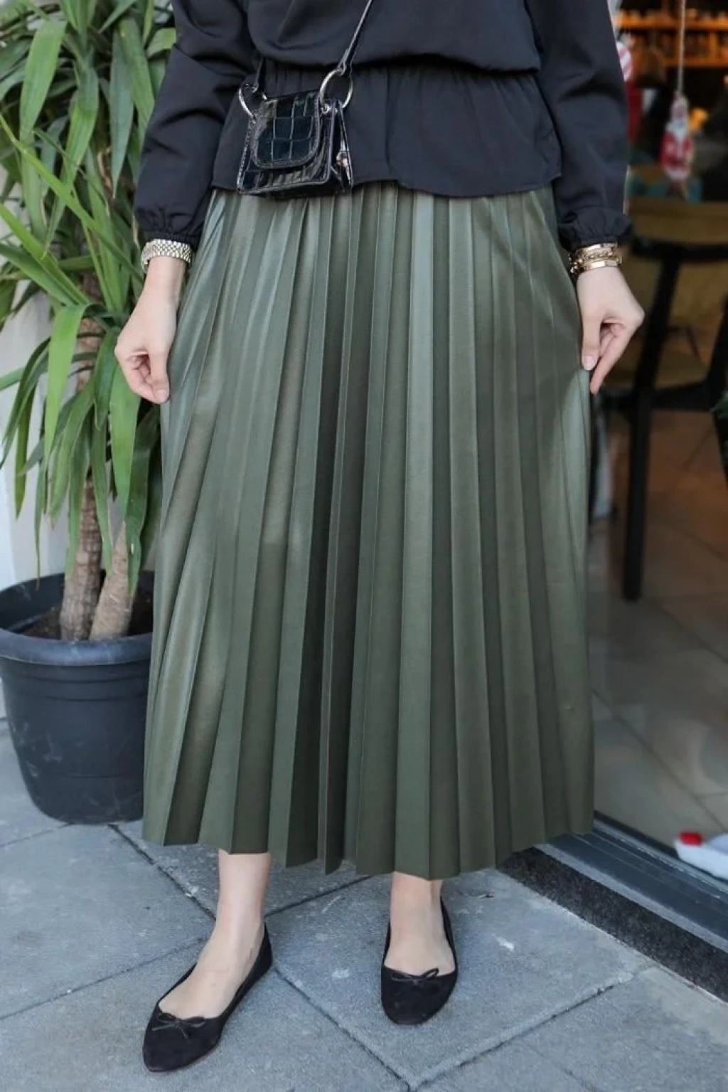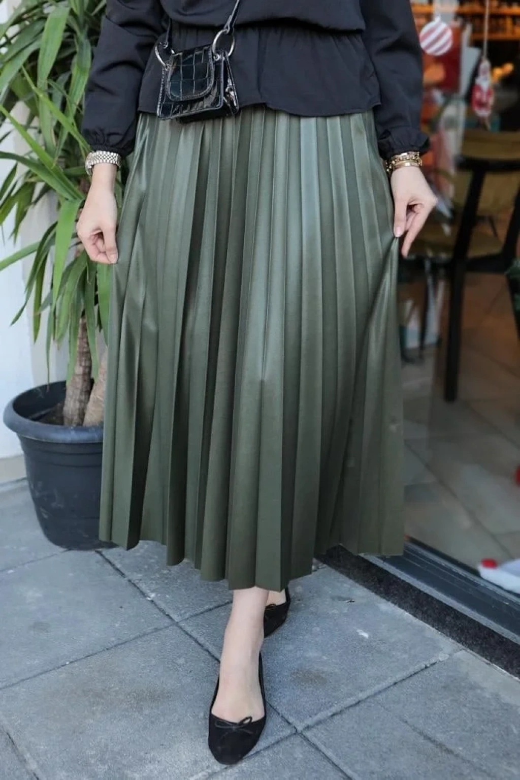 -Sonuç olarak, pileli parlak krep gizli lastikli haki etek, doğallık ve modern tarzıyla öne çıkan ve aynı zamanda rahatlığı ön planda tutan bir giyim parçasıdır.