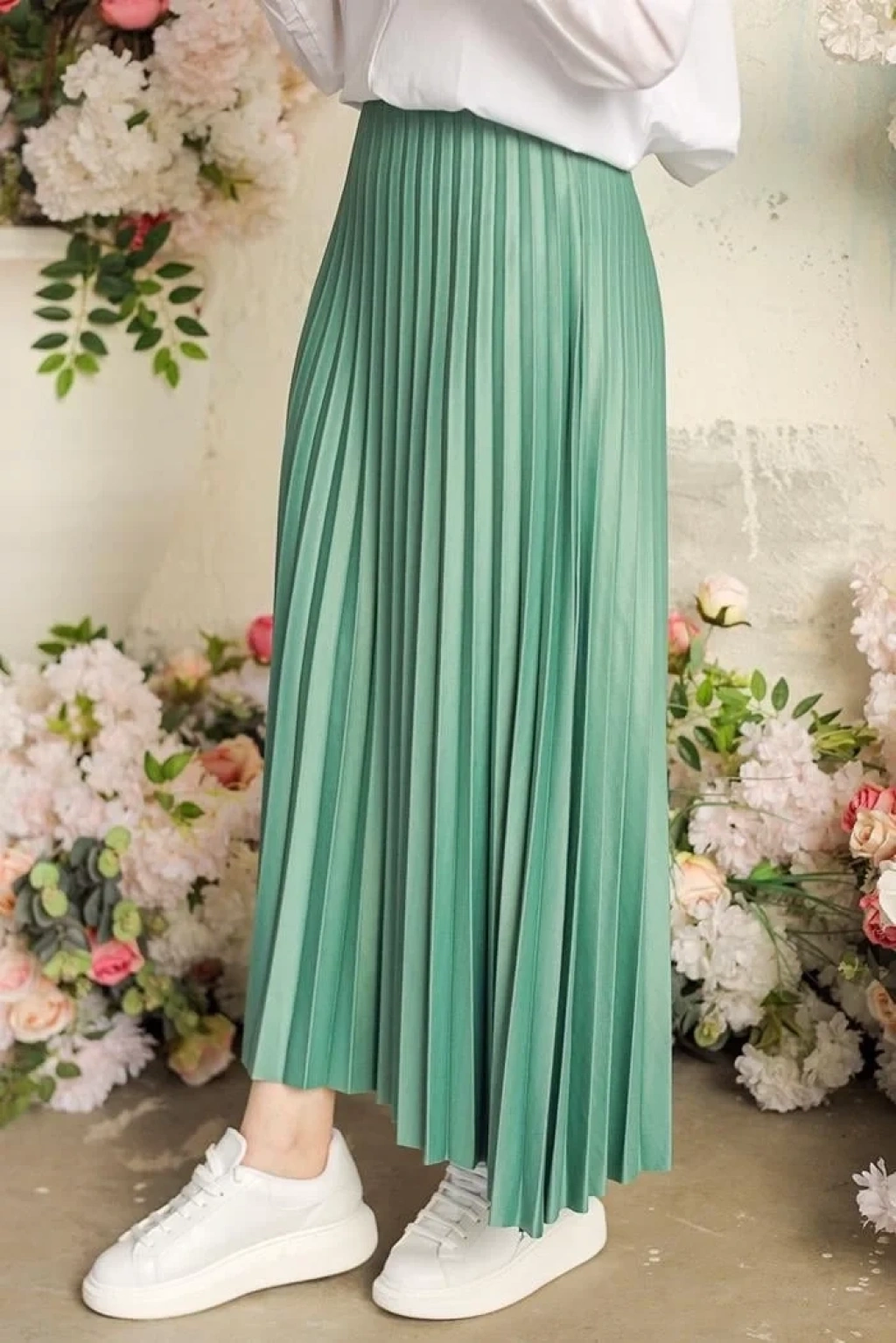 -Pileli detaylar, eteğe hareket ve hacim katarken aynı zamanda feminen bir dokunuş sağlar. Bu detaylar, eteğin tarzını ve çekiciliğini artırır, böylece her kombinde dikkat çekici bir seçenek haline gelir. Mint rengi, ferahlık ve enerjiyi simgelerken, aynı zamanda modern bir tarzı da yansıtır.