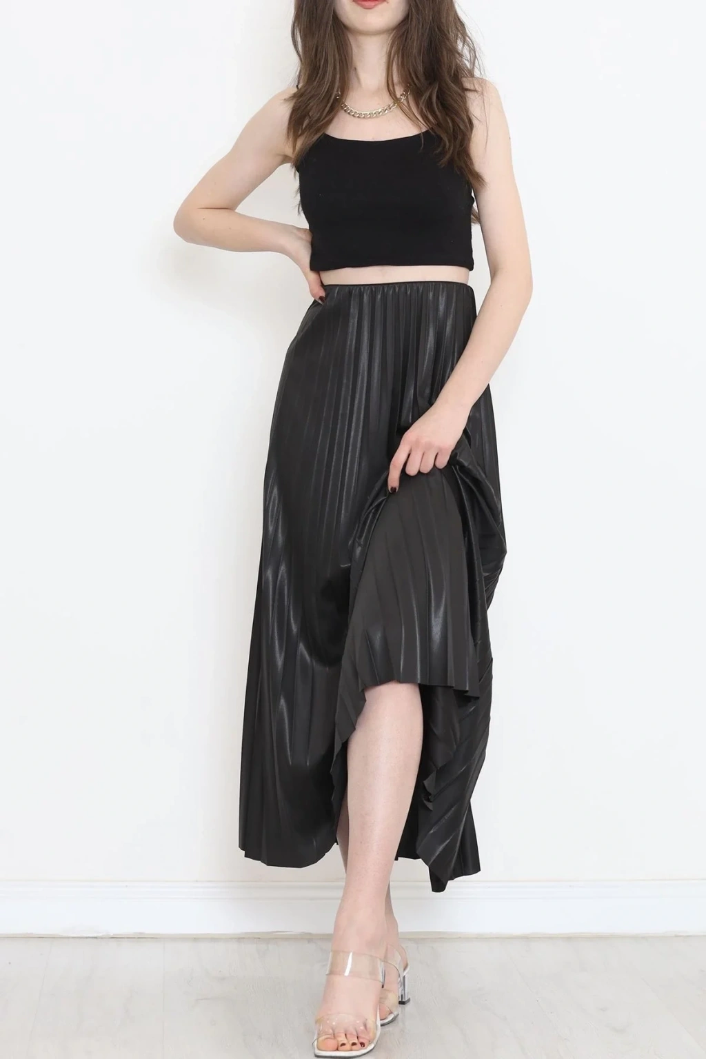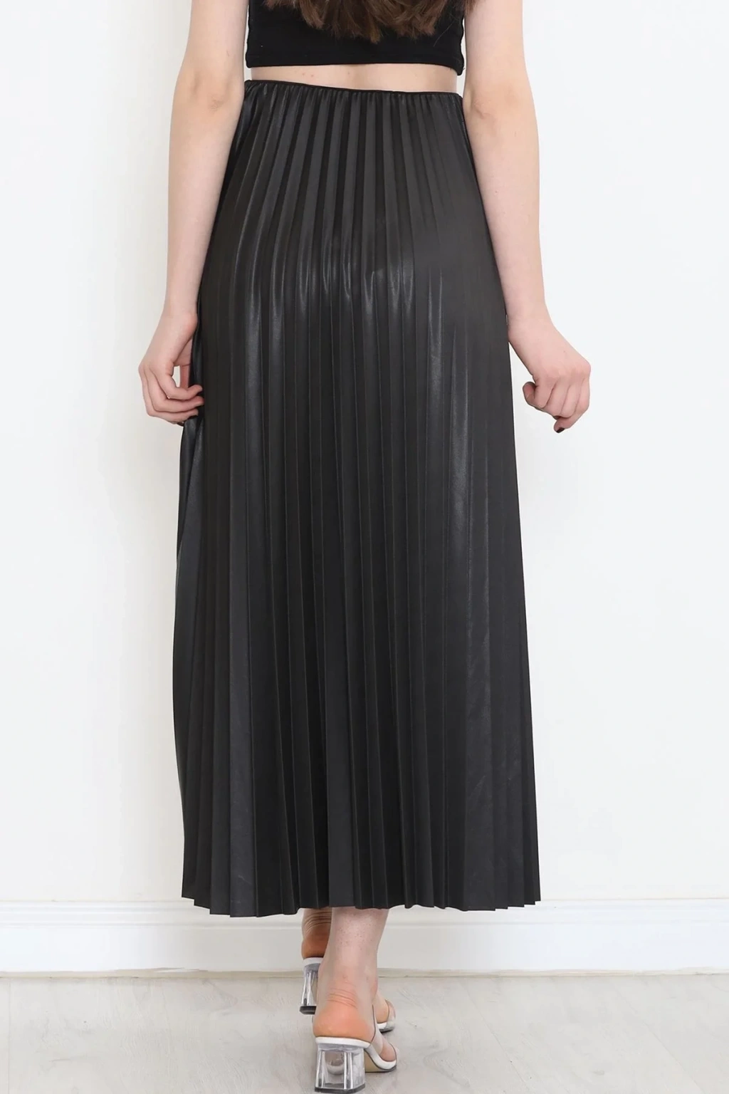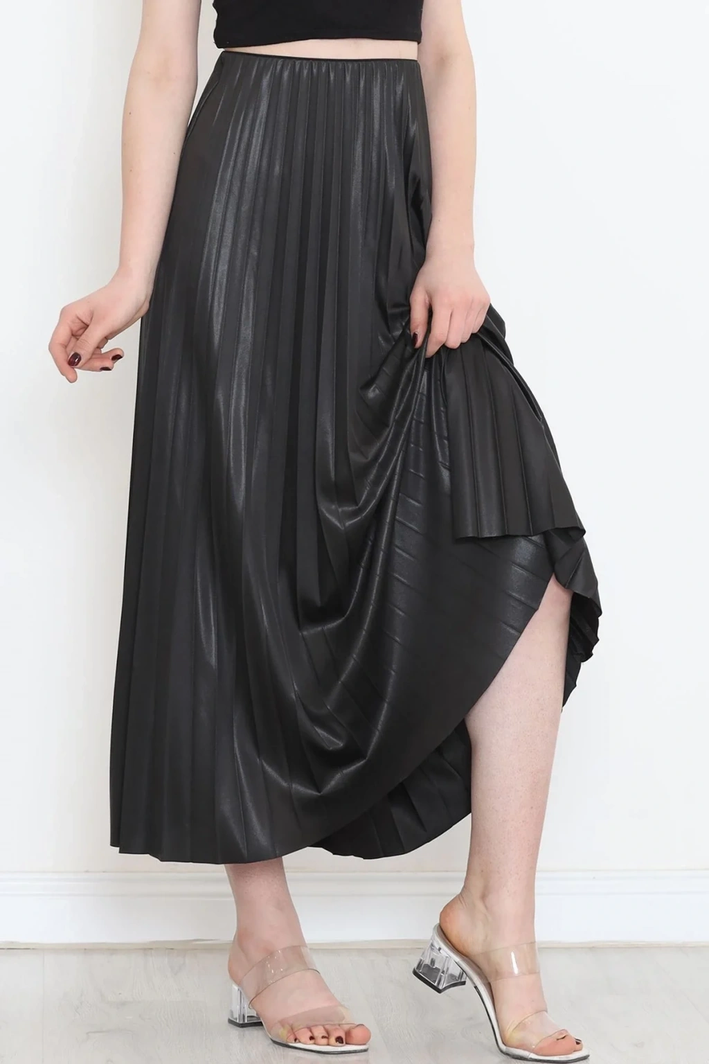 -Pileli parlak krep gizli lastikli siyah etek, şıklığı ve rahatlığı bir araya getiren özel bir giyim parçasıdır. Modern tasarımıyla dikkat çeken bu etek, hem zarif hem de kullanışlıdır.