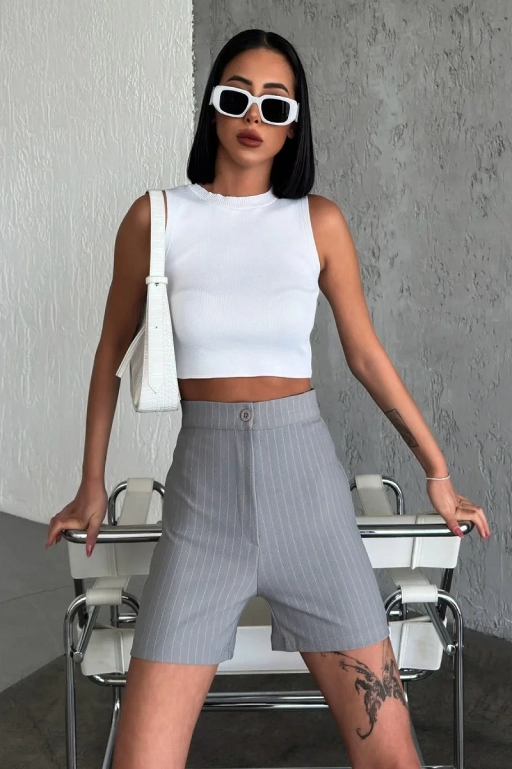 -Bu şık yüksek bel krep çımalı çizgili şort, gri tonuyla zamansız bir şıklık sunuyor. Esnek likralı kumaşı ve şık tasarımıyla hem rahatlık hem de tarz arayanların favorisi olmaya aday.